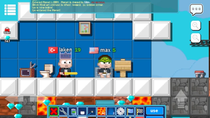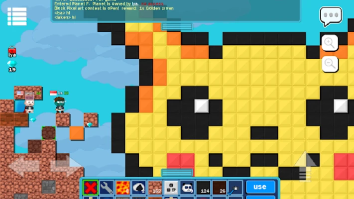 *Planets* Let's start with the first section on main menu, it's indisputable most used part of the game; by typing and entering a planet (well you can also try leaving it empty to dive in random planet but won't work if there aren't active one) you can enter a planet made by other players or by you, once planet is created every player can build and break blocks. If a planet is claimed only owner is able to build and break blocks and other players can only visit and hangout.