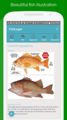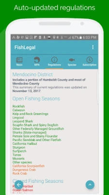 Pro Subscription will add detailed California salt-water fishing regulations, immediate update when regulations change, and beautiful fish identification information! All detailed maps and regulations are preloaded, just install the app and be done. You will always have the newest rules at your finger tip.