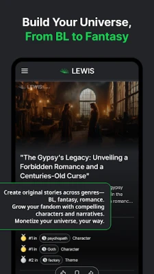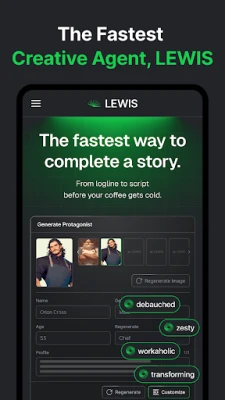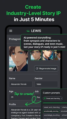Tap prompts that align with your story, characters, plot, and world, and Lewis will auto-complete the details and images for you!